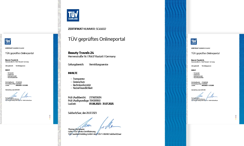 Siamo l'unica agenzia di estetica turistica certificata dal TÜV dal 2012 per il nostro